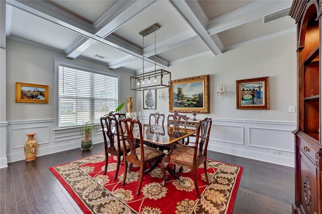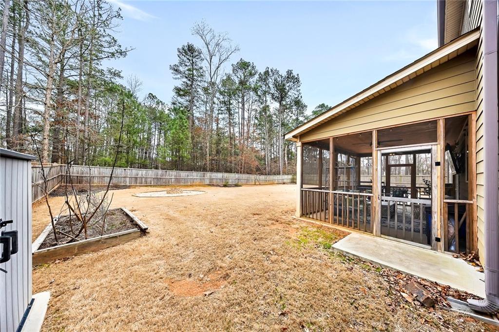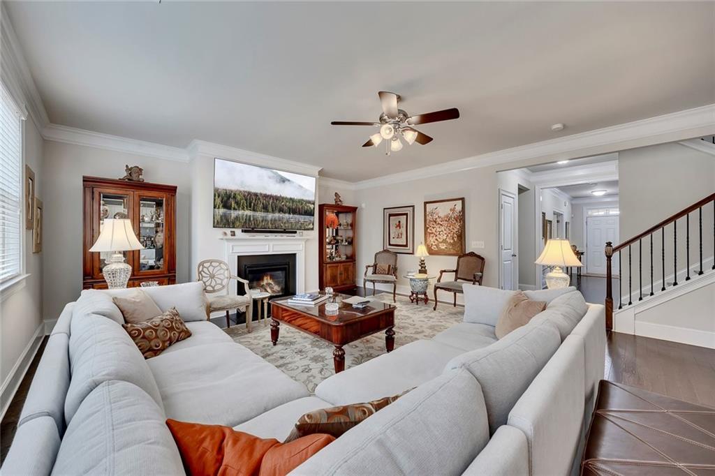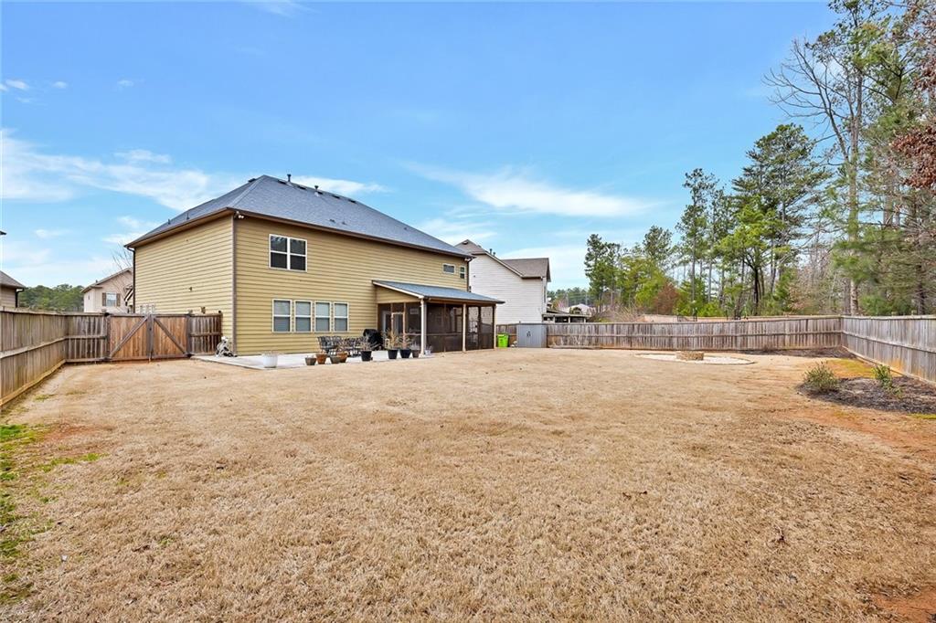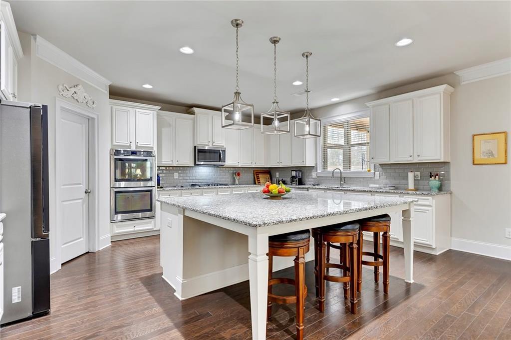 Beautifully maintained newer construction two-story traditional located between downtown Holly Springs and downtown Woodstock with quick access to I-575. Hardwood floors throughout the main level with an open floor plan connecting the living room, dining area, and kitchen. The kitchen features white shaker cabinets, granite countertops, stainless steel appliances, double oven, tiled backsplash, oversized island with seating for five stools, large walk-in pantry, white glass-front refrigerator that remains with the home, and a butler’s pantry connecting to the formal dining room. The formal dining room features a coffered ceiling, wainscoting, and space to comfortably seat up to 12 people, making it ideal for hosting and entertaining. Main level also includes a private office and full bathroom, offering flexibility for guests or a main-level bedroom option. Upstairs features a spacious primary suite with a separate bonus room behind a barn door, perfect for a sitting area, office, or media space. The primary bathroom includes a large walk-in shower with sitting ledge, soaking tub, double vanities, and an oversized walk-in closet. Two secondary bedrooms share a Jack-and-Jill bathroom with double vanities, while a third upstairs bedroom includes its own private bathroom. All upstairs bedrooms feature walk-in closets. Outdoor living includes a large screened-in porch and separate oversized patio overlooking one of the largest fully fenced, flat backyards in the neighborhood, complete with a firepit area and plenty of room for a pool or additional outdoor entertaining space. The home also includes several TVs that remain with the property, including an 85-inch TV in the living room, an 85-inch TV in the bonus room, and a 65-inch TV on the patio. Located in a swim community with neighborhood pool and playground, close to shopping, dining, and entertainment in both Holly Springs and Woodstock.