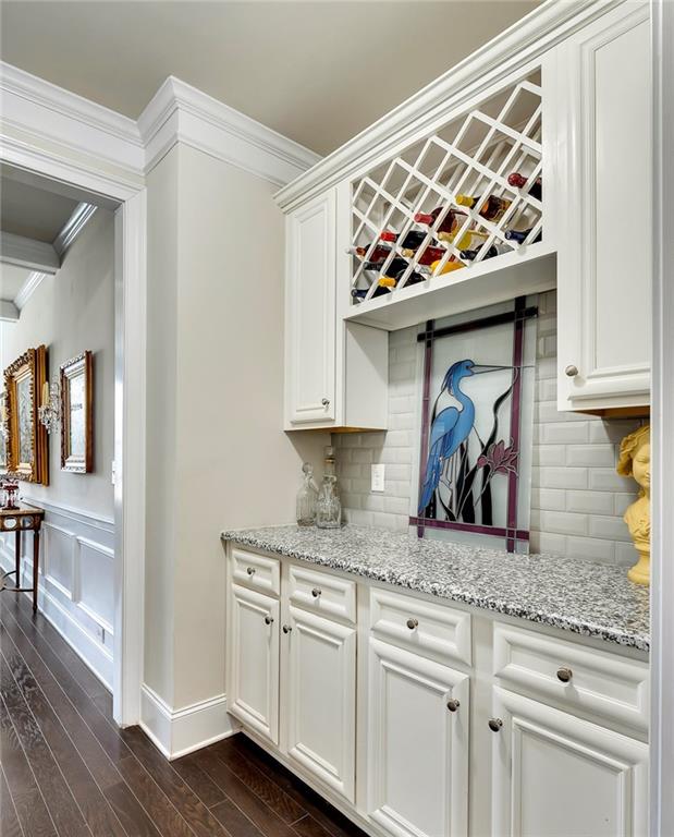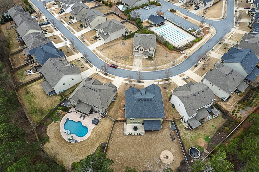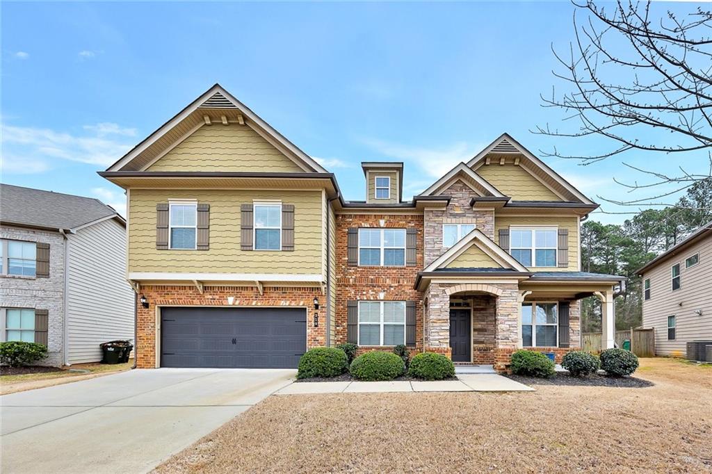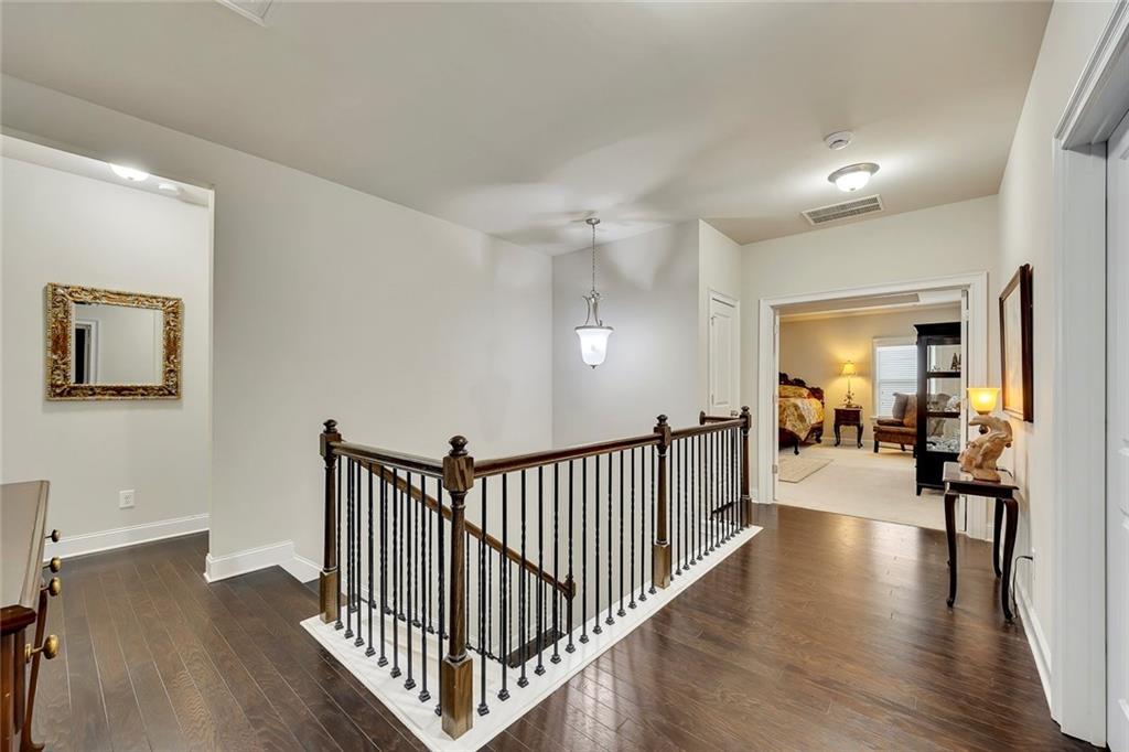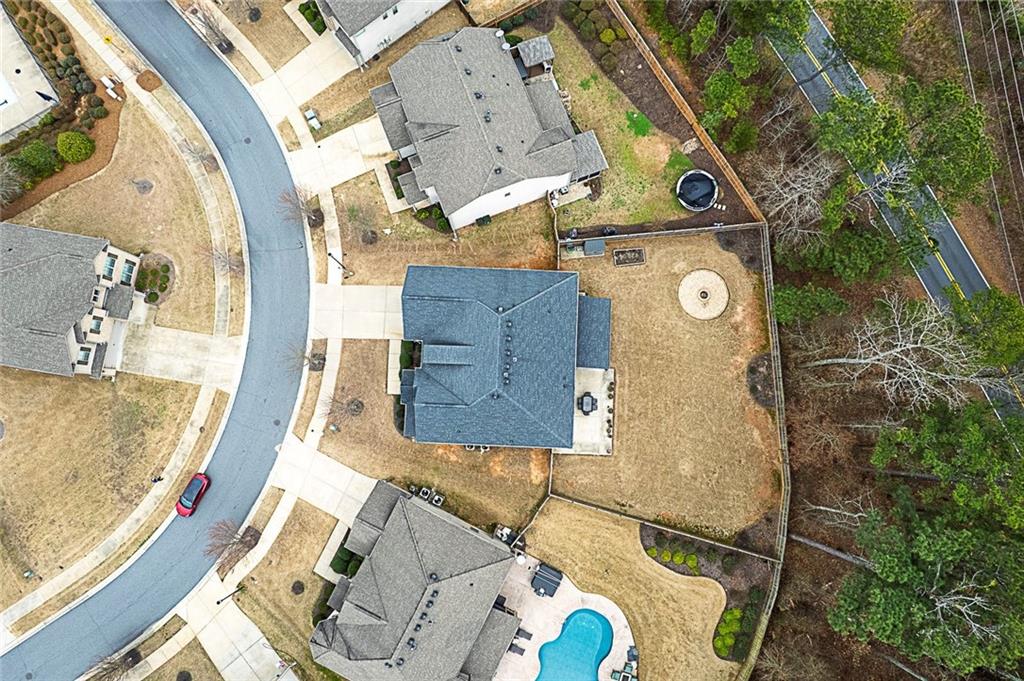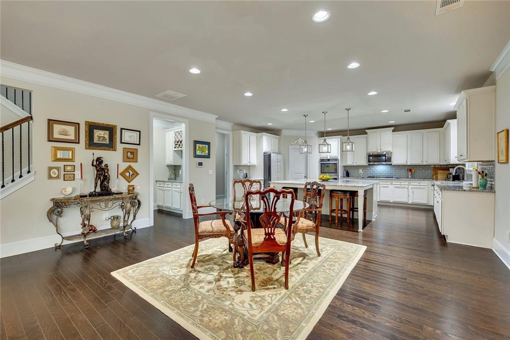 Beautifully maintained newer construction two-story traditional located between downtown Holly Springs and downtown Woodstock with quick access to I-575. Hardwood floors throughout the main level with an open floor plan connecting the living room, dining area, and kitchen. The kitchen features white shaker cabinets, granite countertops, stainless steel appliances, double oven, tiled backsplash, oversized island with seating for five stools, large walk-in pantry, white glass-front refrigerator that remains with the home, and a butler’s pantry connecting to the formal dining room. The formal dining room features a coffered ceiling, wainscoting, and space to comfortably seat up to 12 people, making it ideal for hosting and entertaining. Main level also includes a private office and full bathroom, offering flexibility for guests or a main-level bedroom option. Upstairs features a spacious primary suite with a separate bonus room behind a barn door, perfect for a sitting area, office, or media space. The primary bathroom includes a large walk-in shower with sitting ledge, soaking tub, double vanities, and an oversized walk-in closet. Two secondary bedrooms share a Jack-and-Jill bathroom with double vanities, while a third upstairs bedroom includes its own private bathroom. All upstairs bedrooms feature walk-in closets. Outdoor living includes a large screened-in porch and separate oversized patio overlooking one of the largest fully fenced, flat backyards in the neighborhood, complete with a firepit area and plenty of room for a pool or additional outdoor entertaining space. The home also includes several TVs that remain with the property, including an 85-inch TV in the living room, an 85-inch TV in the bonus room, and a 65-inch TV on the patio. Located in a swim community with neighborhood pool and playground, close to shopping, dining, and entertainment in both Holly Springs and Woodstock.