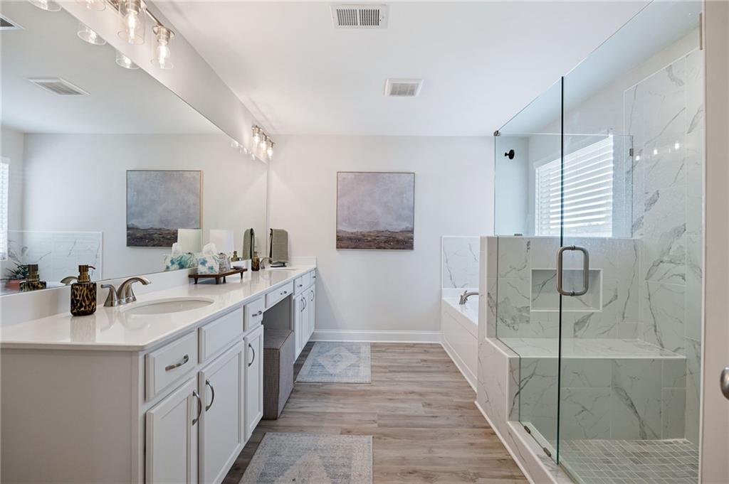 Welcome to this move-in-ready Craftsman-style home located in the highly sought-after Nature Walk at Seven Hills community. Built less than two years ago, this residence showcases numerous high-end upgrades throughout and offers approximately 2,931 square feet of thoughtfully designed living space, including four bedrooms, three full bathrooms, one half bath, and a three-car garage. The main level features an open-concept layout with luxury vinyl flooring throughout. Highlights include an office/flex room, a formal dining room with coffered ceilings and elegant wainscoting, and a spacious family room centered around a beautiful brick fireplace. Large windows provide abundant natural light throughout the home. The chef’s kitchen features white cabinetry, quartz countertops, a large center island, stainless steel appliances, a cooktop with vent hood, a walk-in pantry, a butler’s pantry, mudroom. The seller has invested in extensive upgrades, including enhanced lighting fixtures throughout, added wainscoting in the entryway, multiple bedrooms, and bathrooms, as well as an upgraded vanity in the half bath. All bedrooms are located on the second level. The oversized primary suite features a spacious walk-in closet and a luxurious en-suite bathroom complete with double vanities, a frameless glass shower, and a soaking tub. Three additional bedrooms, two full bathrooms, and a conveniently located laundry room complete the upper level. A versatile loft area provides additional space for a playroom, media room, or sitting area. The exterior offers professionally landscaped grounds with an irrigation system, a fully fenced backyard with three access gates, and a covered rear patio. The extended driveway provides additional parking alongside the three-car garage. Residents of Nature Walk at Seven Hills enjoy resort-style amenities, including a water park with slides and splash features, an Olympic-size pool, tennis and pickleball courts, playgrounds, walking trails, a clubhouse, and a variety of year-round community events.