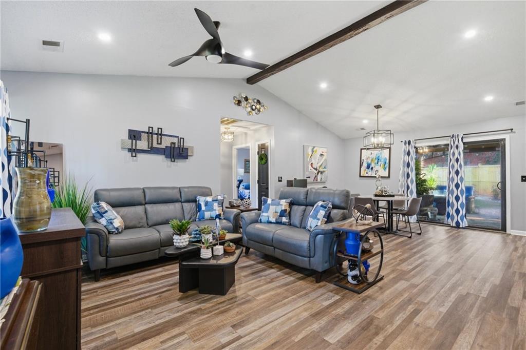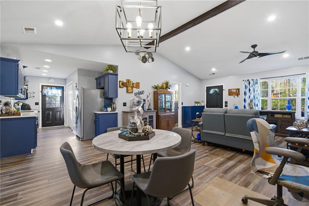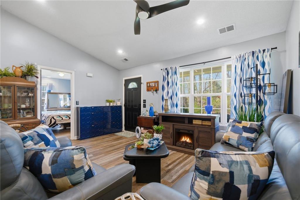 Welcome to the peaceful, relaxing life you've been dreaming of! Nestled in a quiet, "hidden gem" neighborhood on the shores of Lake Lanier, this beautifully updated ranch home offers the perfect blend of modern style and outdoor adventure on a nice level lot. Step inside to find a home designed for both beauty and ease. The beamed vaulted ceiling and natural light from front to back welcomes you as you enter the great room. The stunning kitchen is real treat, featuring gorgeous quartz countertops that pop beautifully against custom blue cabinetry and white backsplash. Recent updates extend to the primary bath, which boasts new cabinetry and double sinks, updated lighting, and fresh flooring. With easy-care laminate throughout the entire home, you can spend less time on chores and more time enjoying the incredible lake lifestyle. Relax on your inviting front porch or retreat to the private backyard cabana that stands over pavestone rock and enjoy total tranquility. This gated community offers a resort-style experience with amenities that are truly second to none: Boater's Paradise: Residence enjoy community boat slip - park your boat at no additional charge, a dedicated storage area for trailers/boats, and a wide community boat ramp for easy water access. Stay active with on-site tennis and pickleball courts, swimming pool, and clubhouse. The community offers events, social clubs. Hop on your golf cart to visit neighbors, count the deer, or feed the geese. Conveniently located with easy access to Gainesville, Dawsonville, and Dahlonega, you are never far from shopping, dining, and entertainment. This home is situated within the highly-regarded Hall County School District, offering an amazing lifestyle at an unbeatable price. Your lake life starts here—move in and start making memories today!